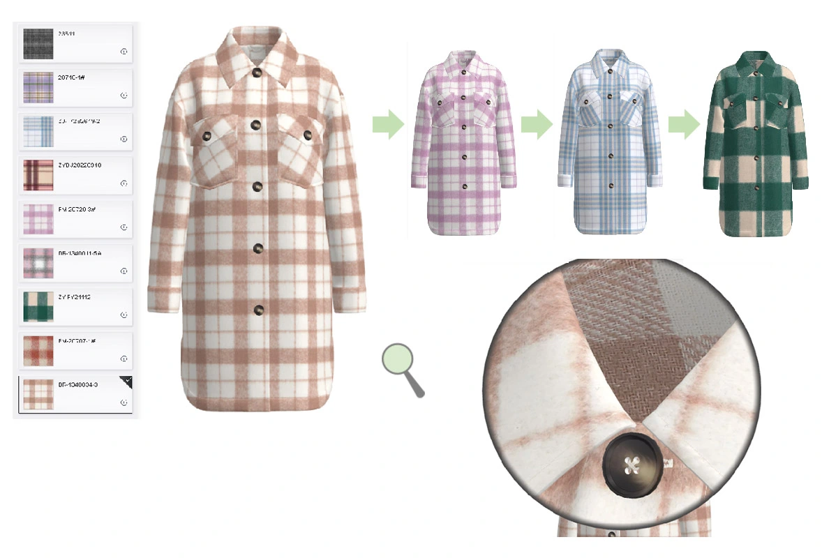 中国とバングラデシュの3Dデザインチームは、CADを選択した場合にサンプルの三次元効果を表示するスマートなサンプリングプロセスを作成しました。オンラインで選択し、布地をインテリジェントに変更し、迅速に意思決定することができます。